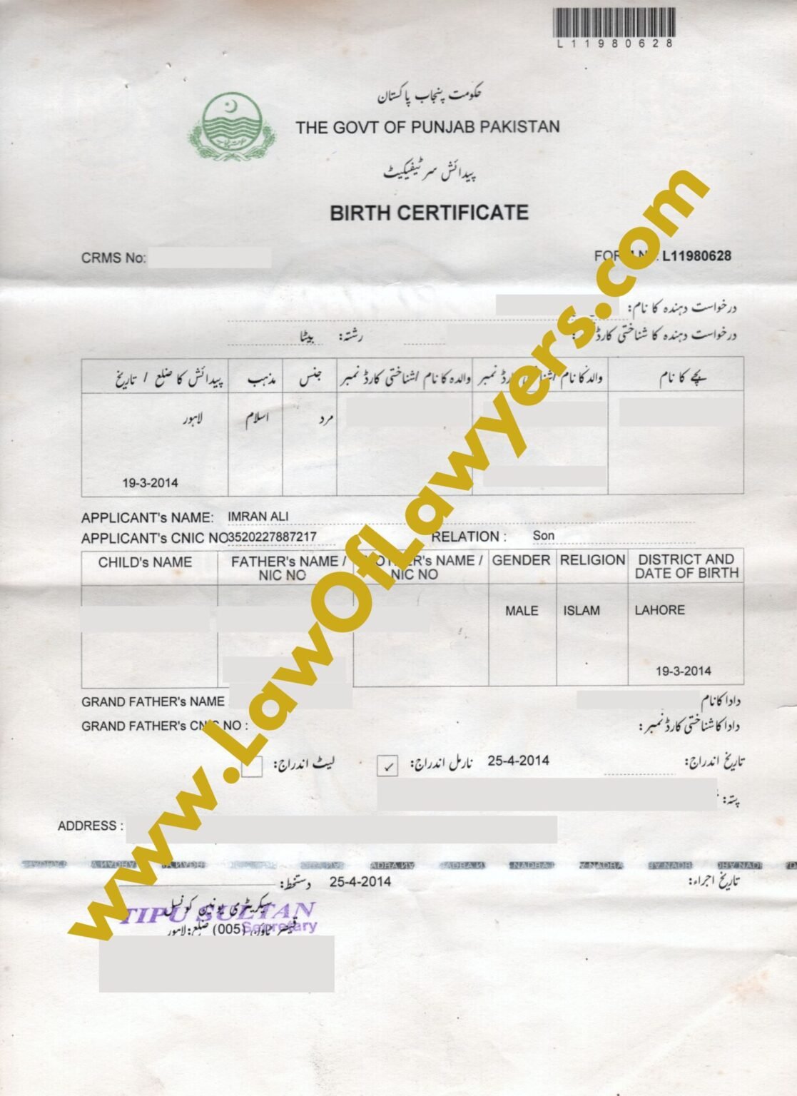Get Pakistani NADRA Birth Certificate CRC Zahid Law Associates