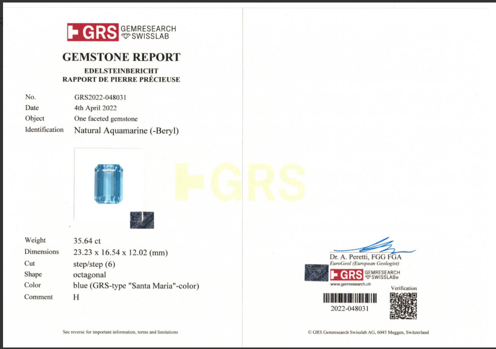 35 64 Carat Natural Aquamarine Santa Maria Color GRS Certificate