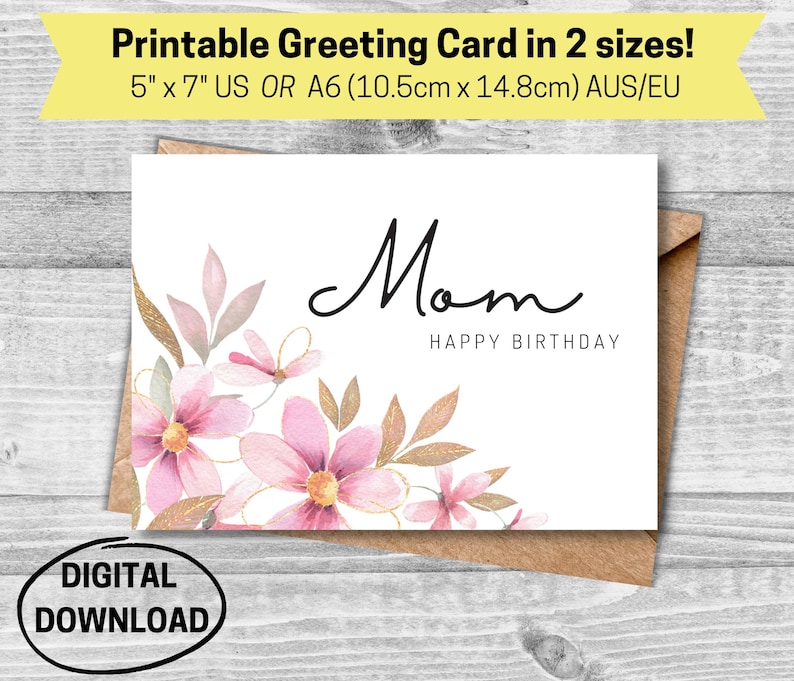 Printable Birthday Card for Mom Birthday Gift Floral Card Envelope