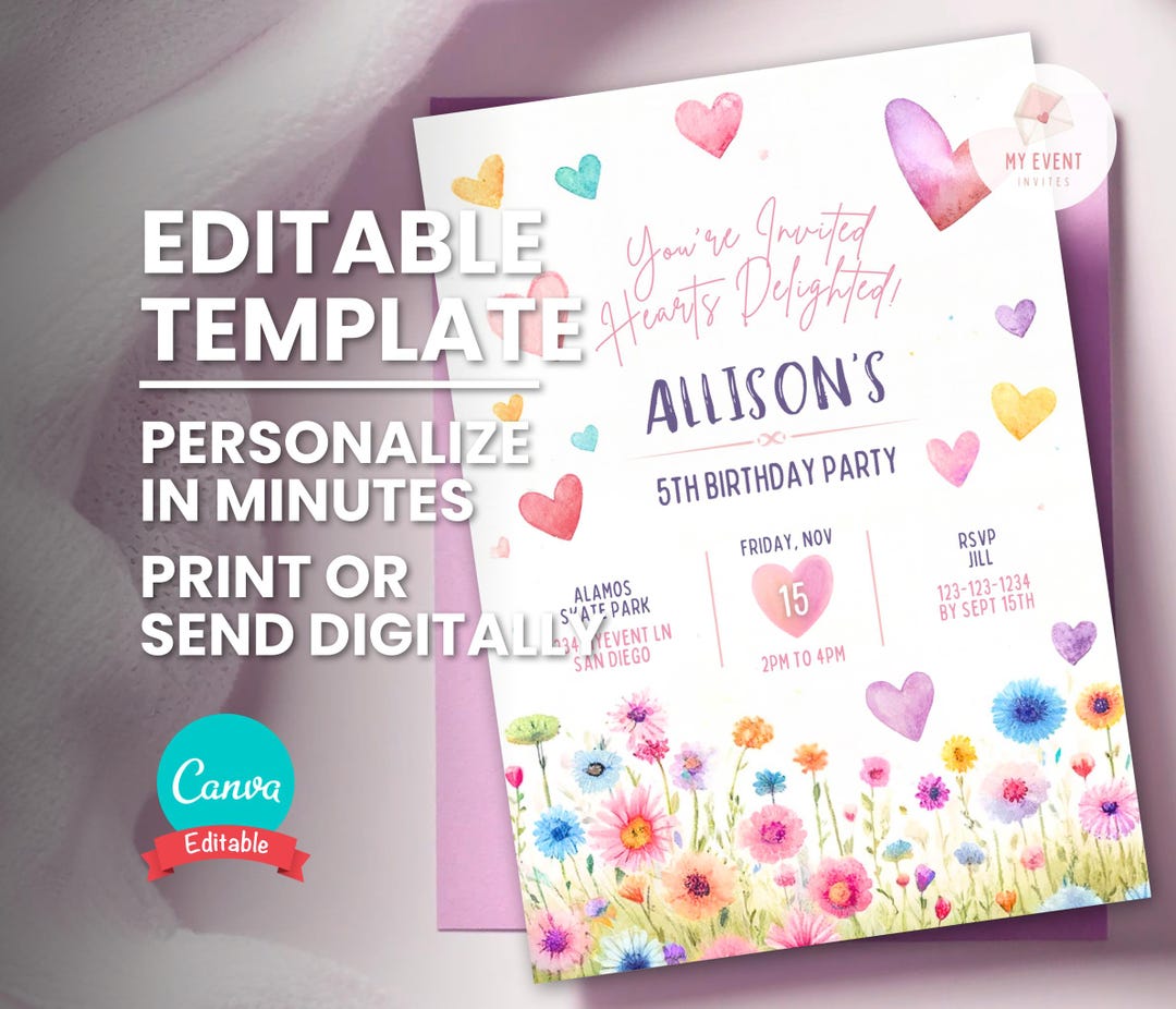 Heart Theme Birthday Invite Wildflower Party Invitation Editable