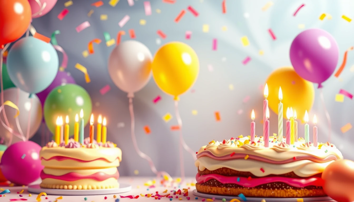A birthday cake centerpiece surrounded by balloons confetti Premium