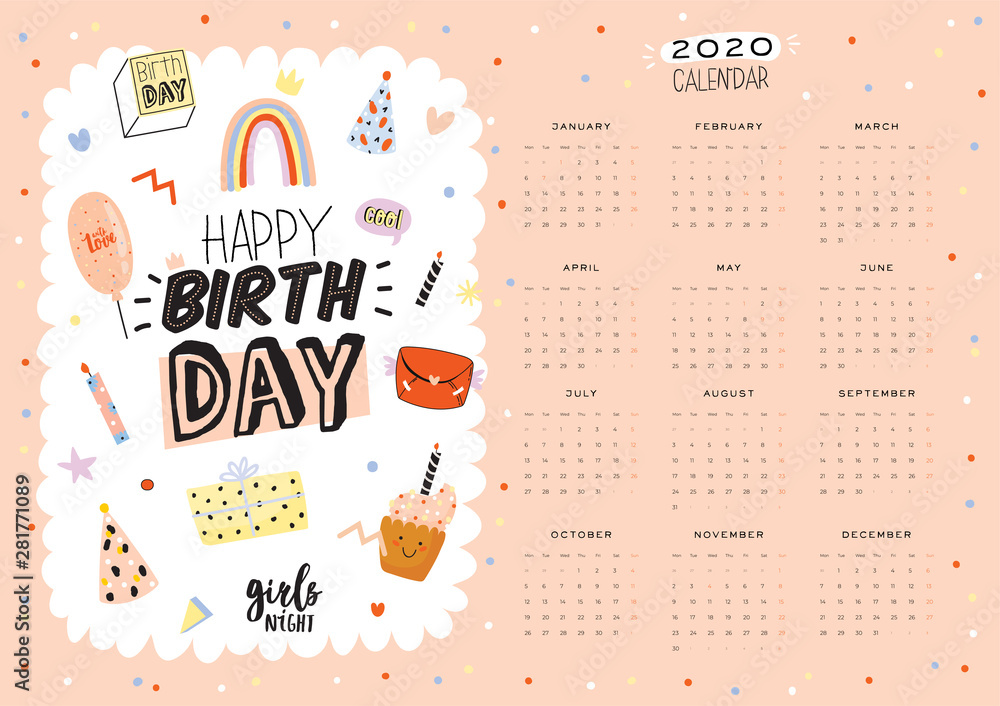 Happy Birthday Wall Calendar 2020 Yearly 库存矢量图(免版税)1446823559