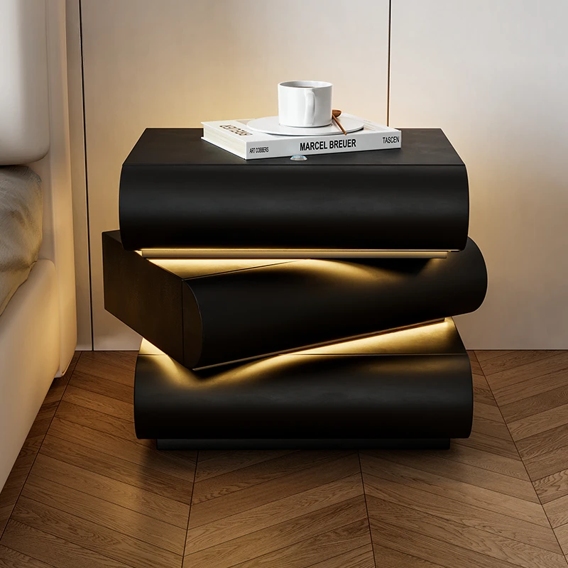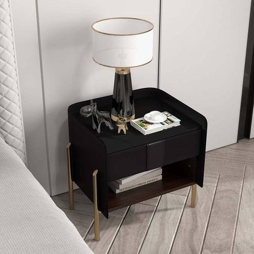Modern Black Nightstand Sintered Stone Top Bedside Table with Charger