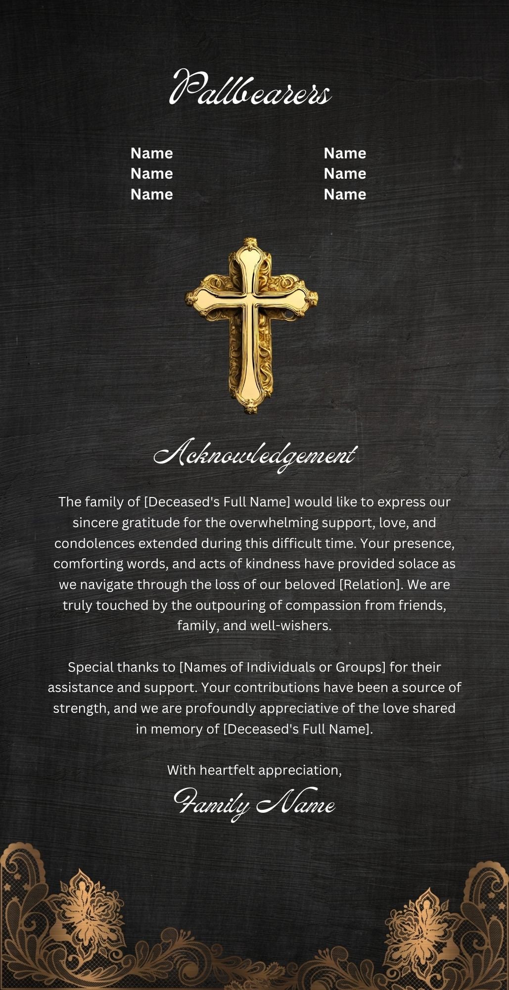 17 x11 FUNERAL OBITUARY TEMPLATE (2 pages) Black Gold Funeral Progr