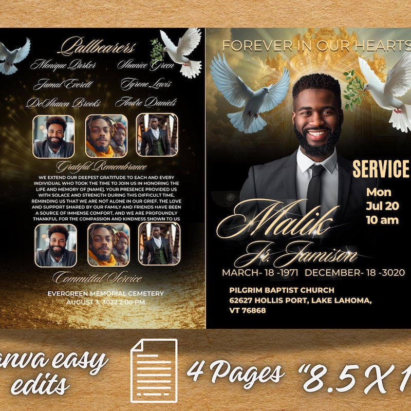 Black Gold Obituary Template: 4 page Funeral Program (8 5x11) Etsy