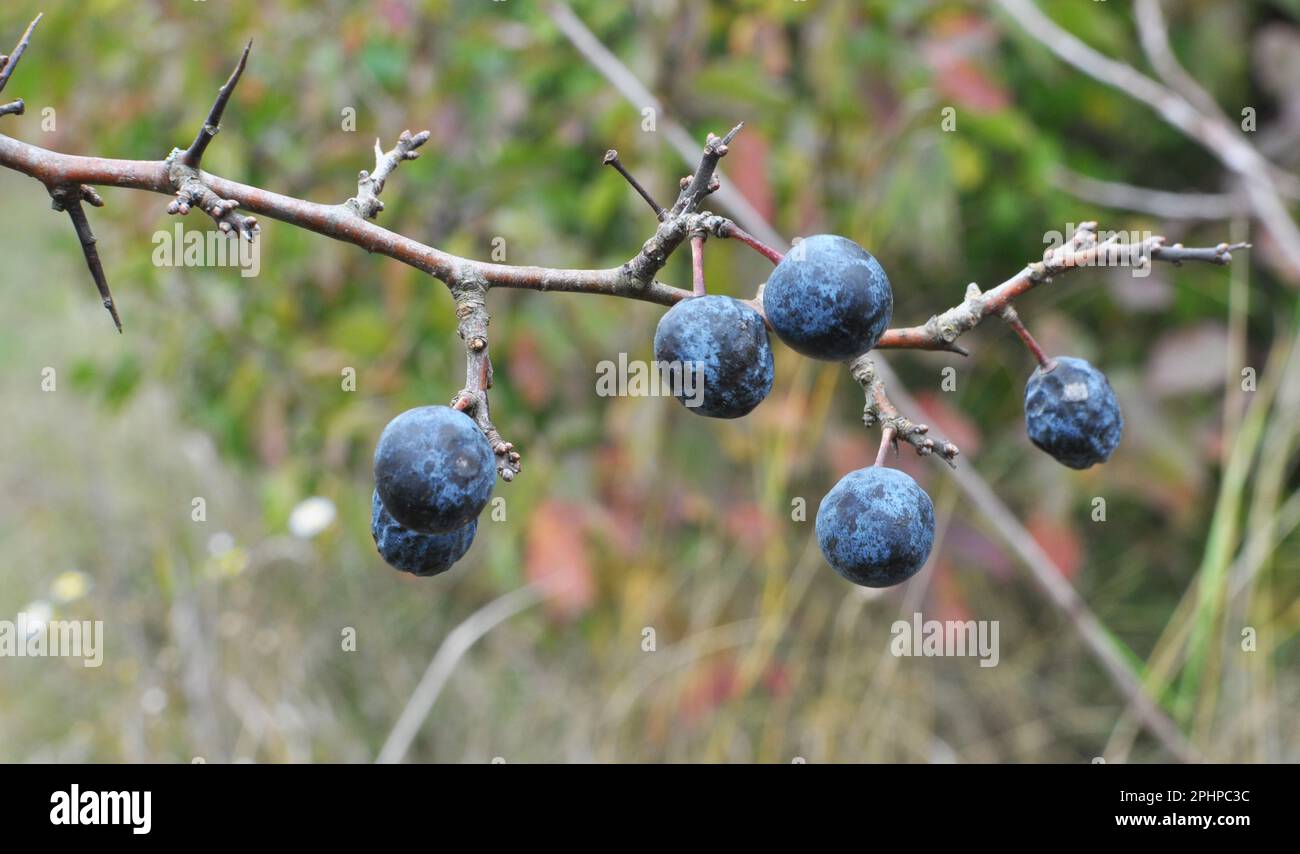 Prunus Spinosa Berries in the Summer Blackthorn or Sloe Bluish Fruits