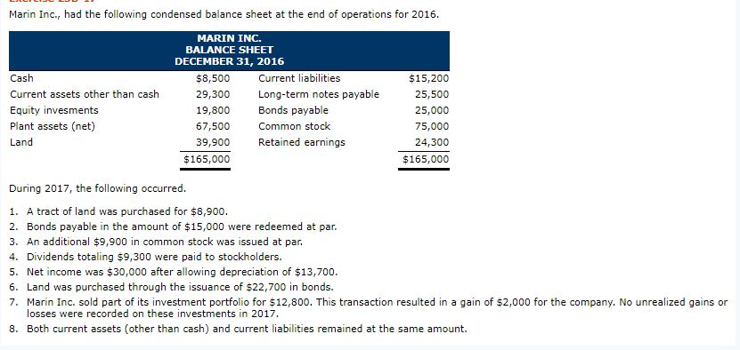 Solved Marin Inc had the following condensed balance sheet Chegg com