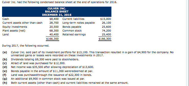 Solved Culver Inc had the following condensed balance sheet Chegg com