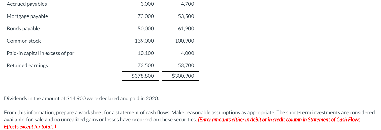 Below is the comparative balance sheet for Tamarisk Chegg com
