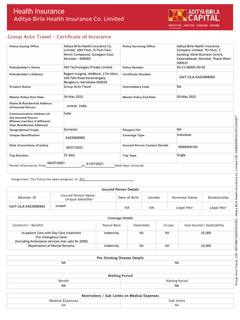 COI (Certificate of Insurability) PDF Cancer Life Insurance