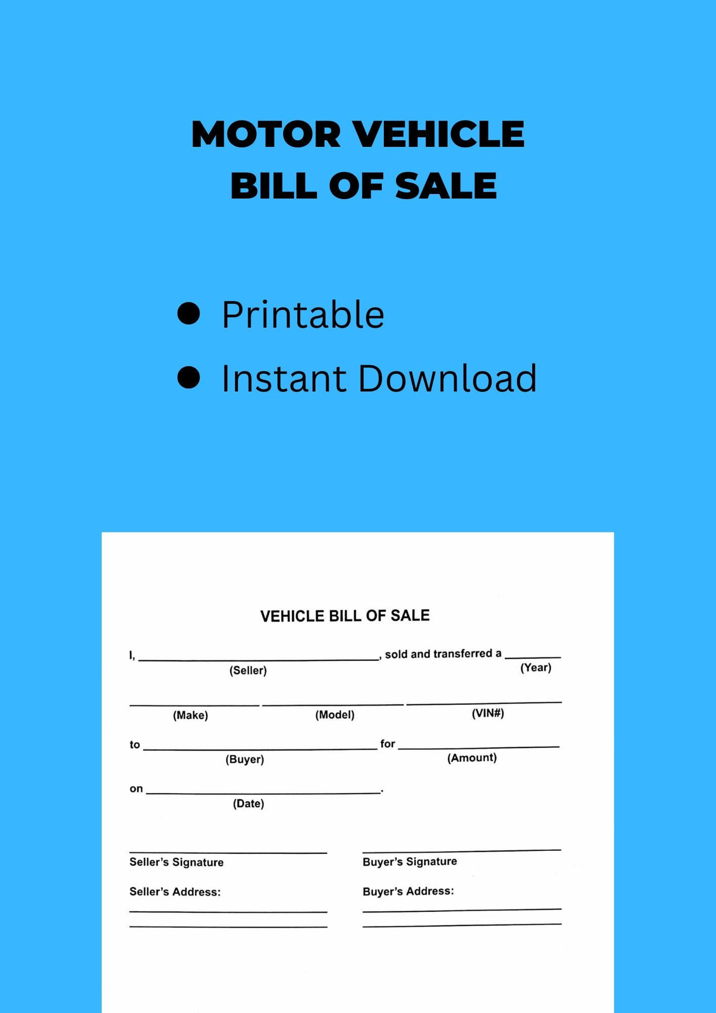 Printable Motor Vehicle Bill of Sale Template Easy DIY Legal Transfer