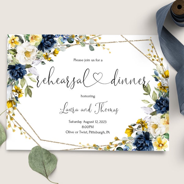 Luxury Yellow and Blue Floral Wedding Invitation Template Premium AI