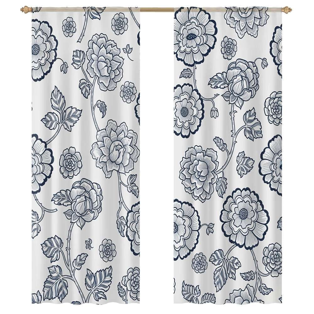 Blue Floral Pattern Background Sheer Window Curtains for Living Room