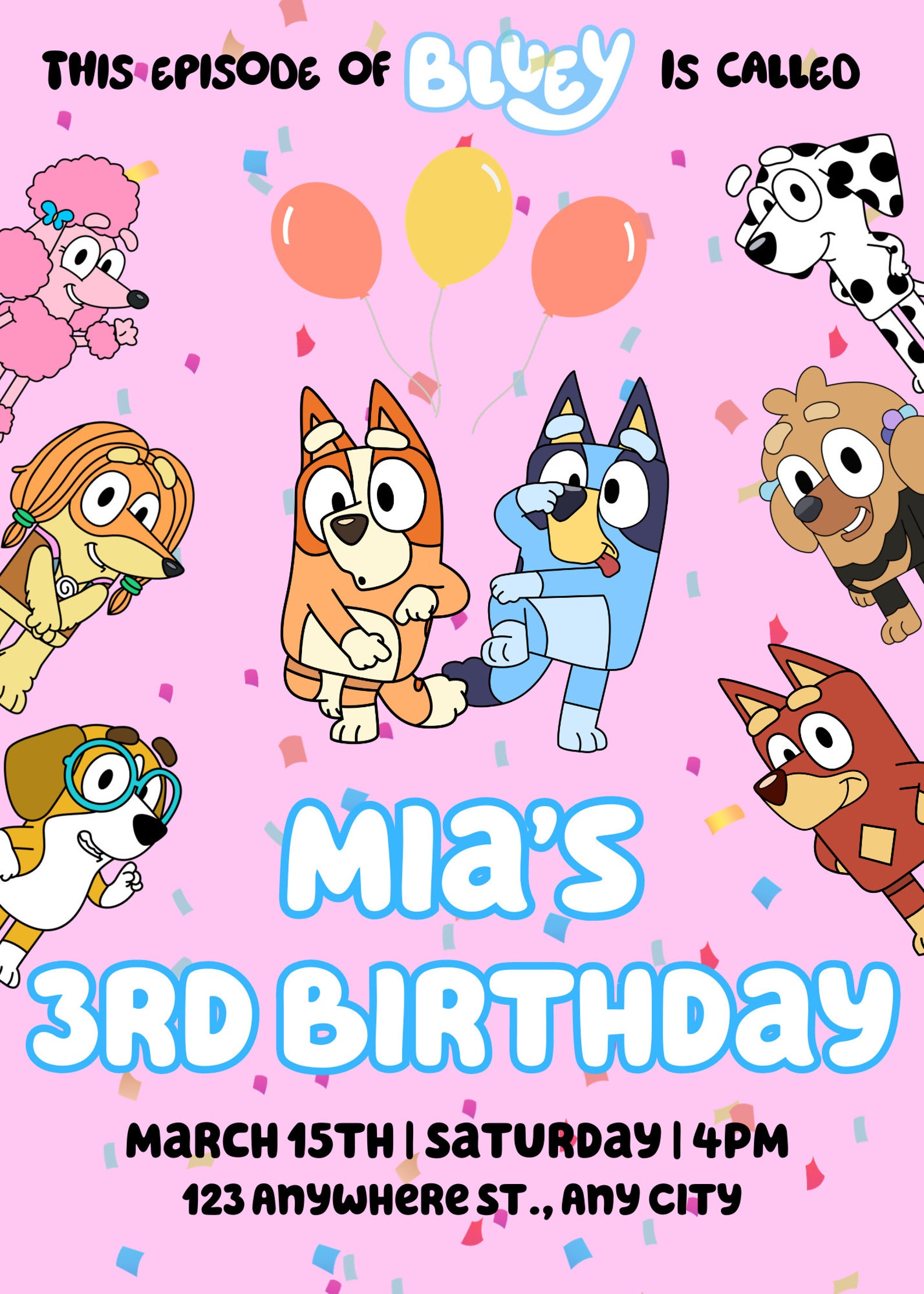 Bluey Invitation Editable Girl Birthday Template for Kids Digital