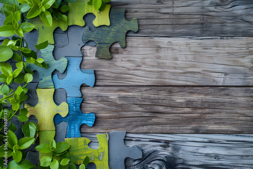 Blue green and gray puzzle pieces creating a border on the edge of a