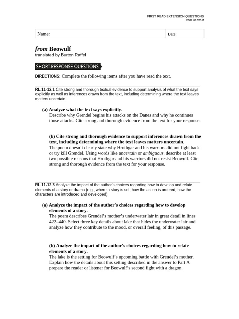 Beowulf worksheet (with answer key) by Teaching to Inspire TpT