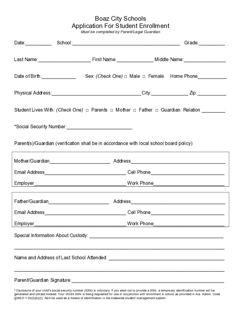 Fillable Online Boaz City Schools Application For Student Enrollment
