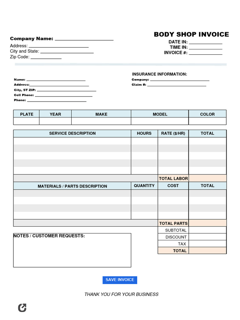 Free Auto Body (Mechanic) Invoice Template PDF Word eForms