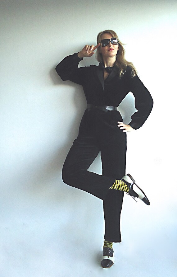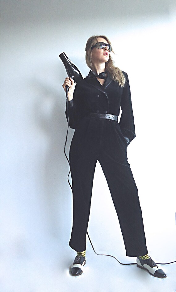 JESSIE BOND 80s Killer Black Velvet Jumpsuit with Sat Gem