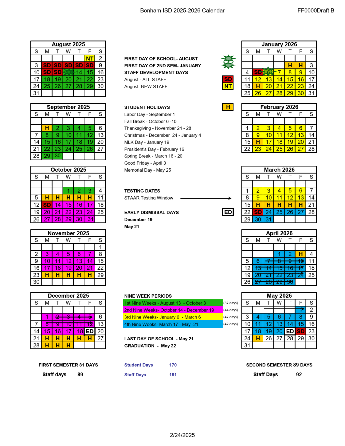 Bonham ISD School Calendar 25 26 PDF revised EduCounty