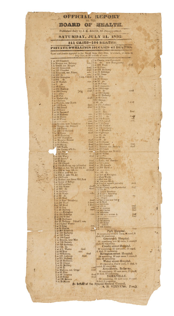 Bonhams : NEW YORK CHOLERA EPIDEMIC OF 1832 Official Report of the