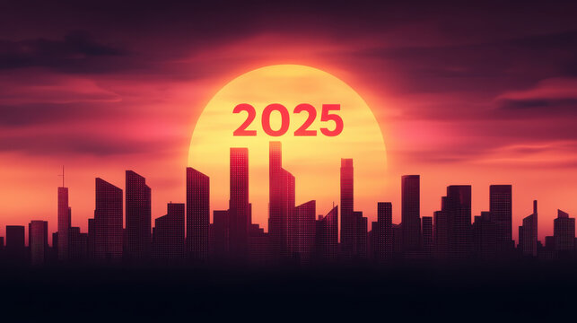 Urban Skyline at Dusk with Bright 2025 Numbers Illuminating the Future