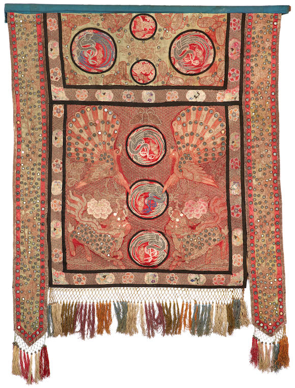 Bonhams : An embroidered silk hanging panel with applied mirror bosses