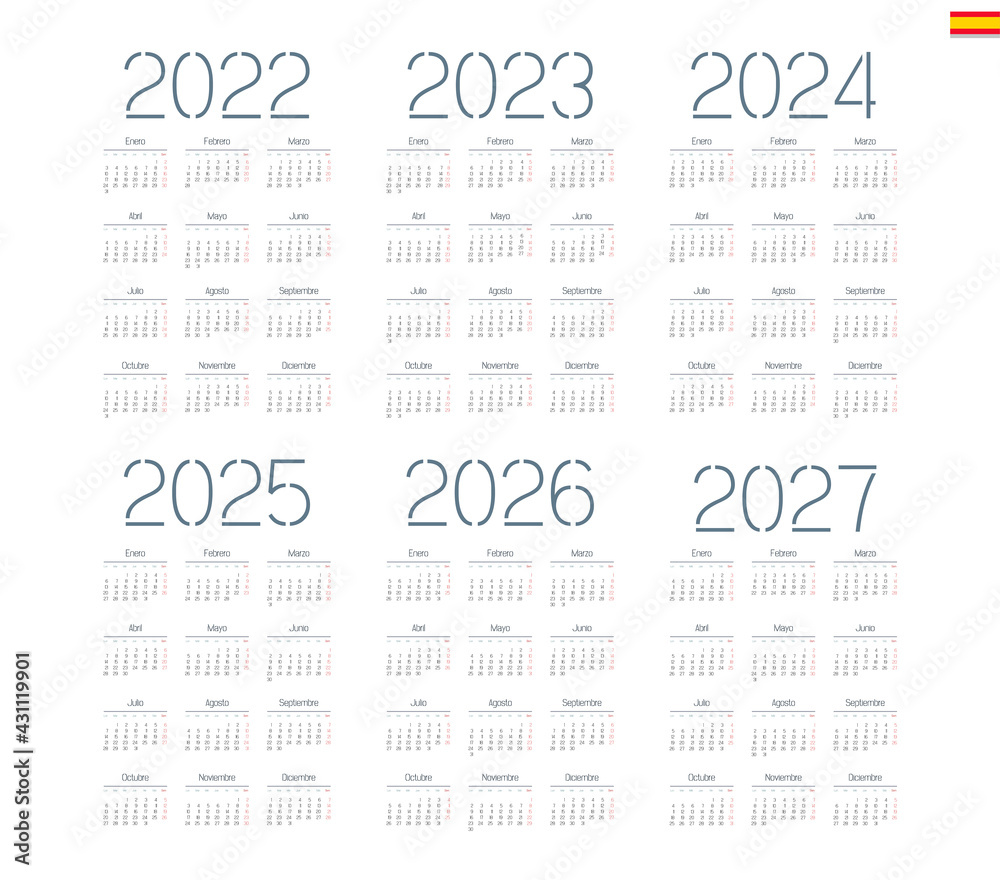 Spanish Calendar 2022 2023 2024 2025 2026 2027 On White Background