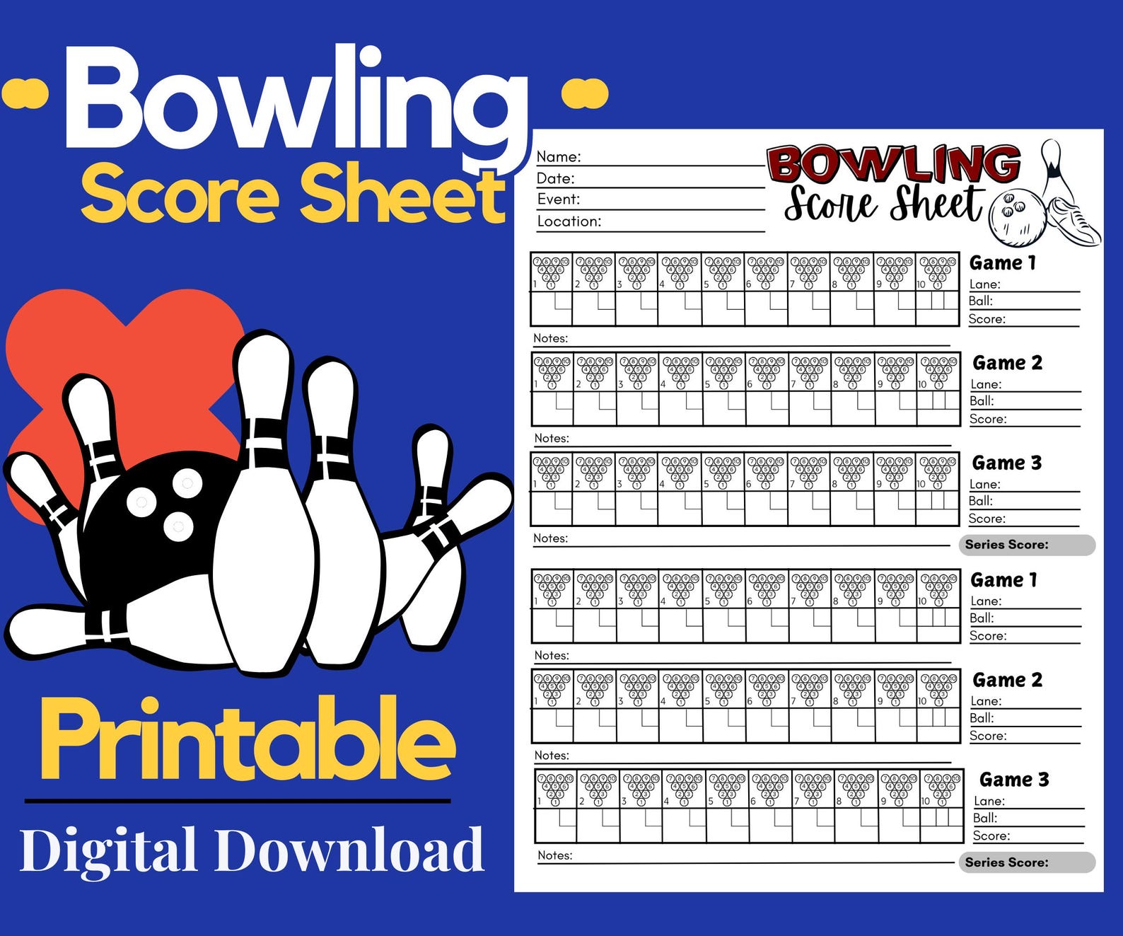 Printable Bowling Score Sheets Digital Download Score Card Printables