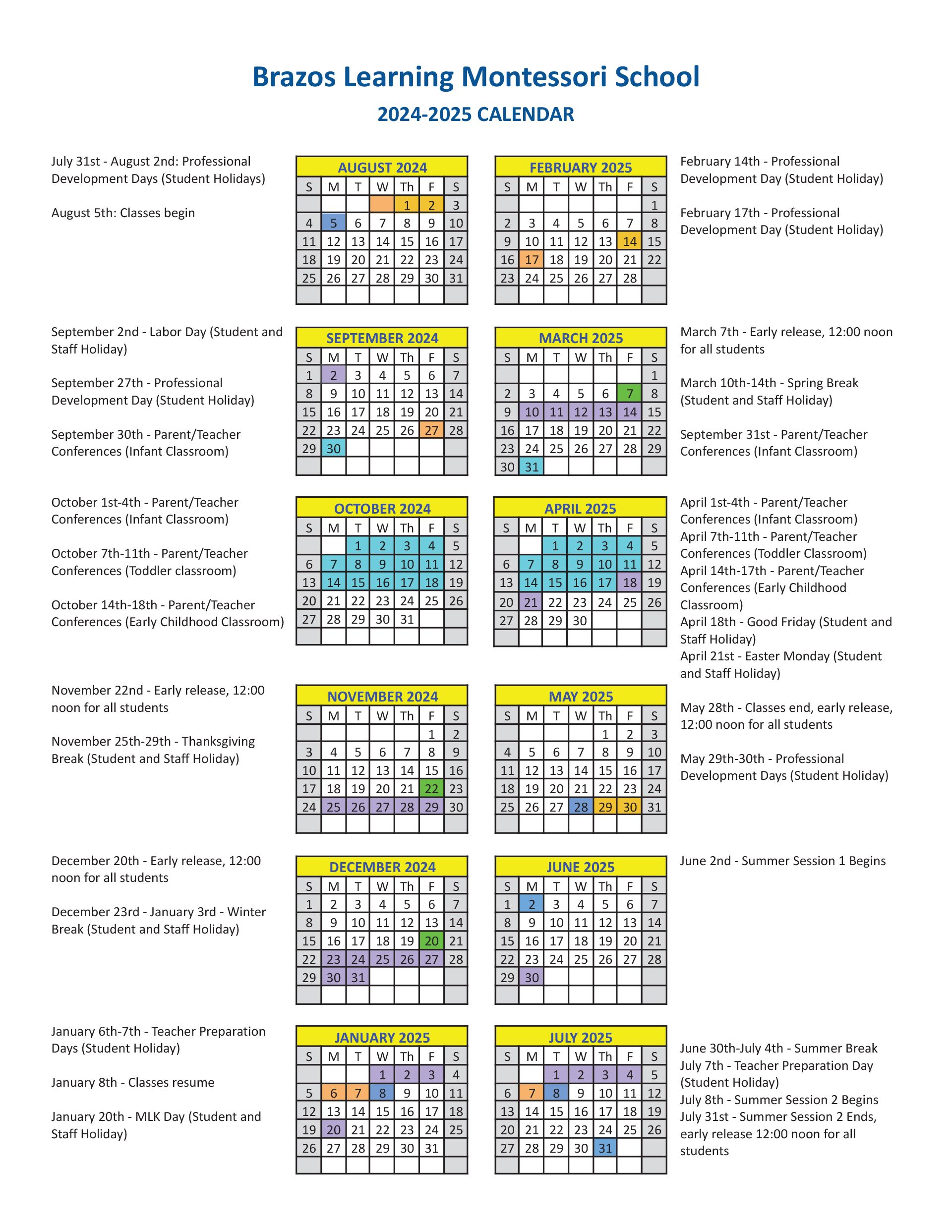 Calendar Brazos Learning Montessori School Richwood Texas