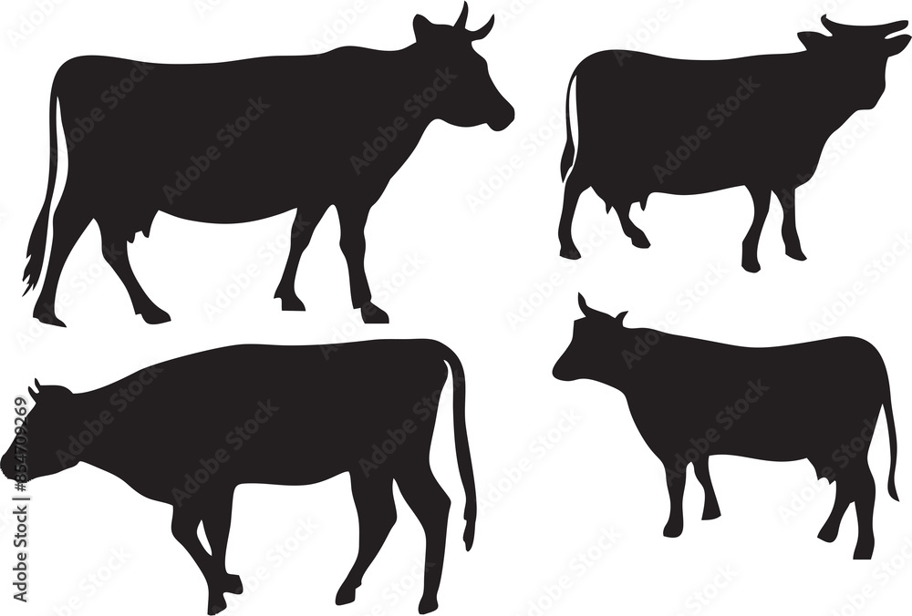 Cows buffalo and bulls in different poses and positions on white