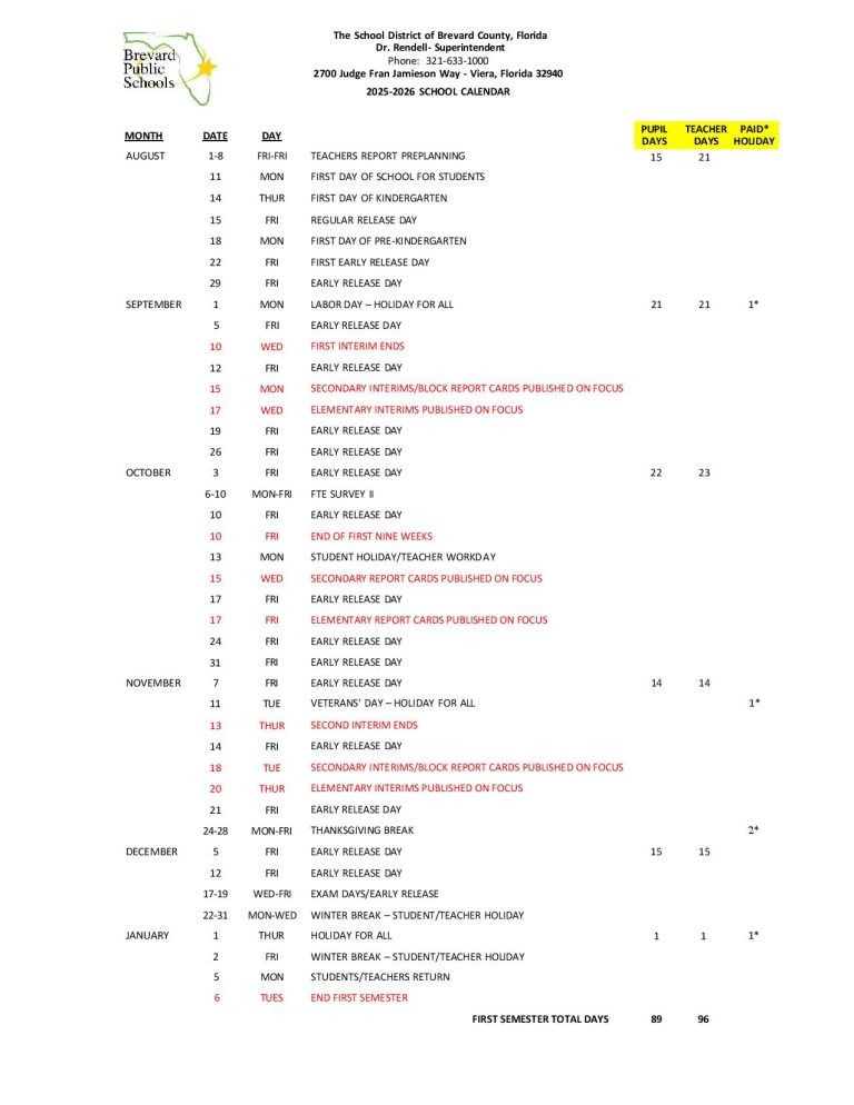 Brevard County Schools Calendar 2025 2026 Public Schools