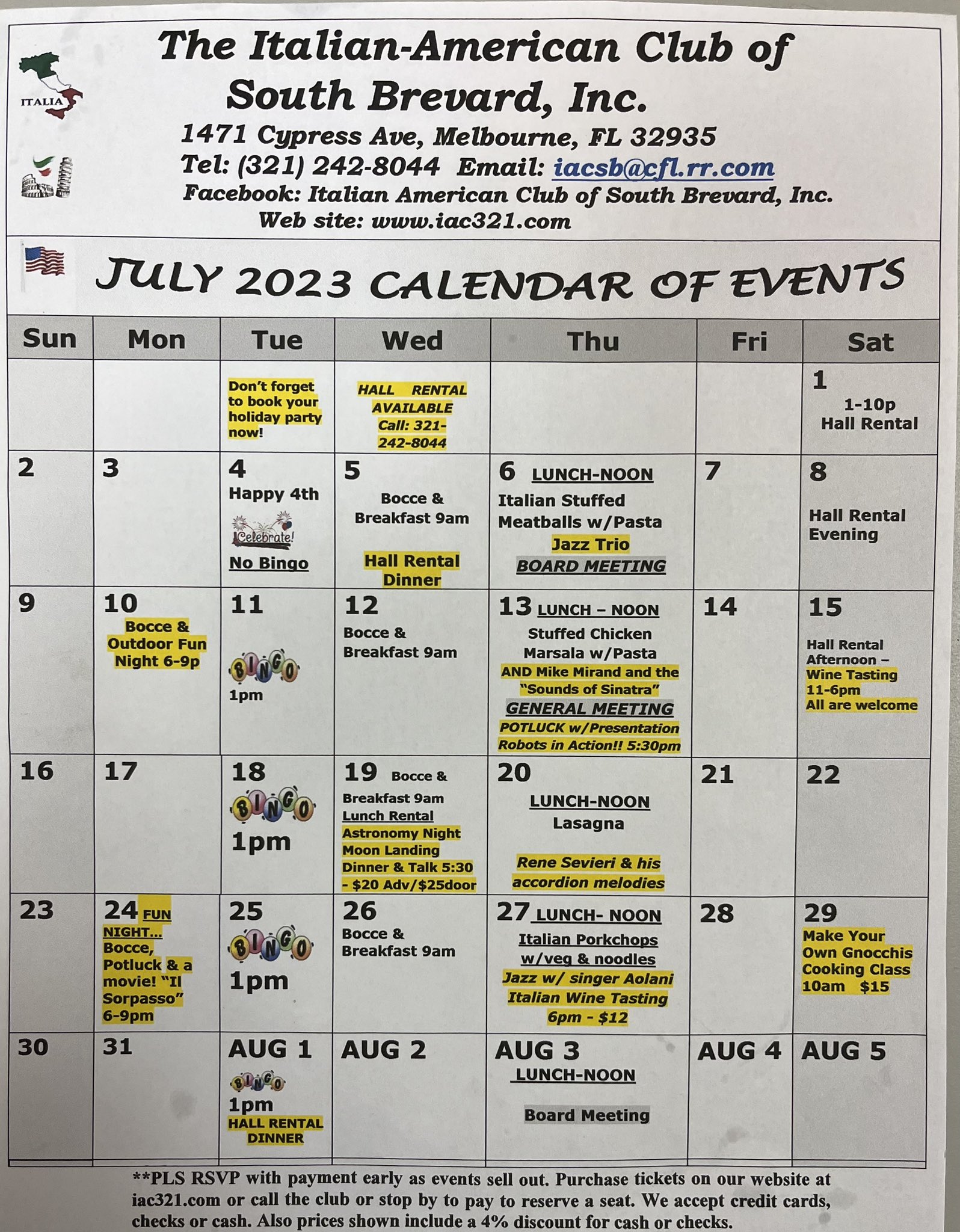 Italian American Club of Brevard on Twitter: quot Our July calendar is out