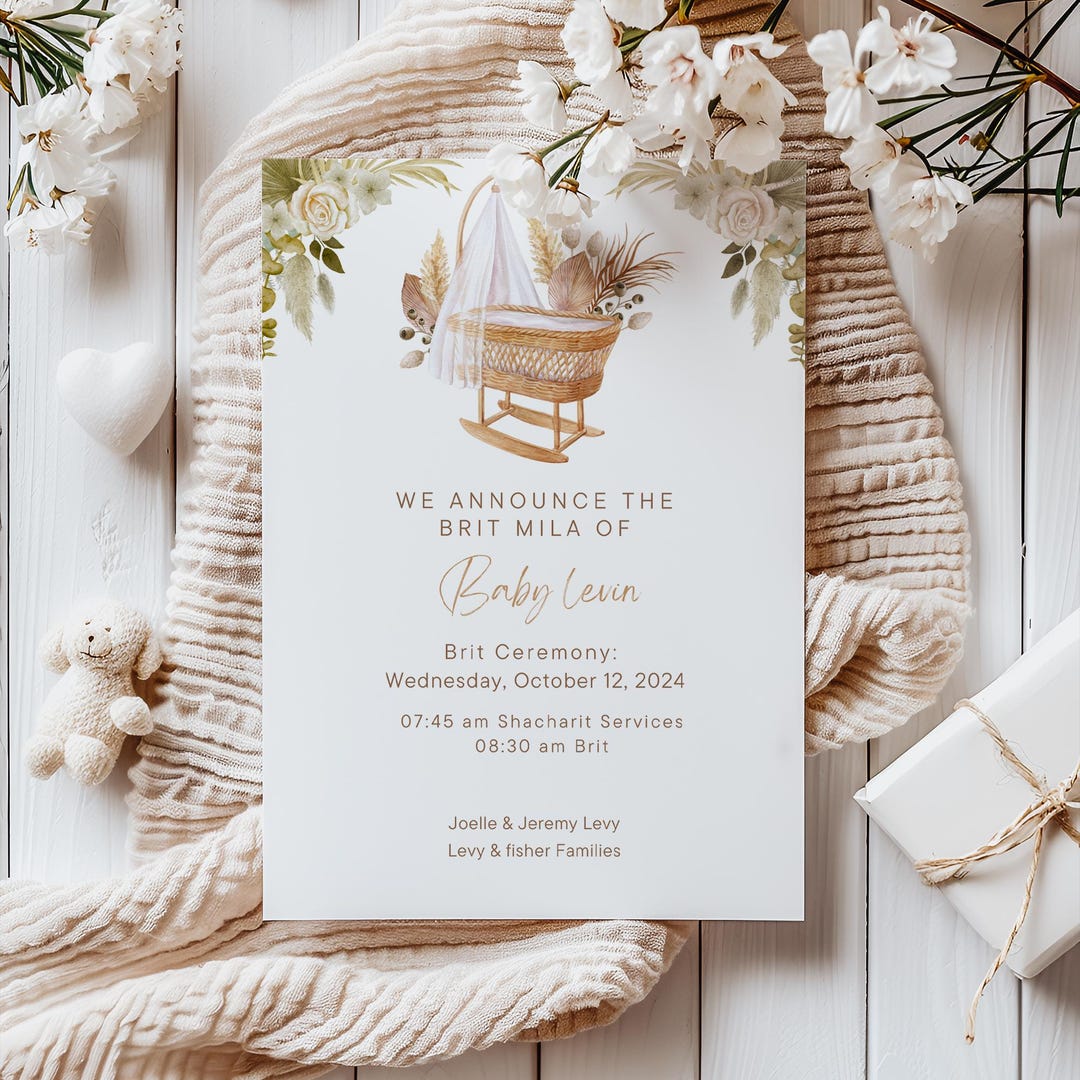 Editable Brit Milah Invitation Template: Beige Floral Design (canva