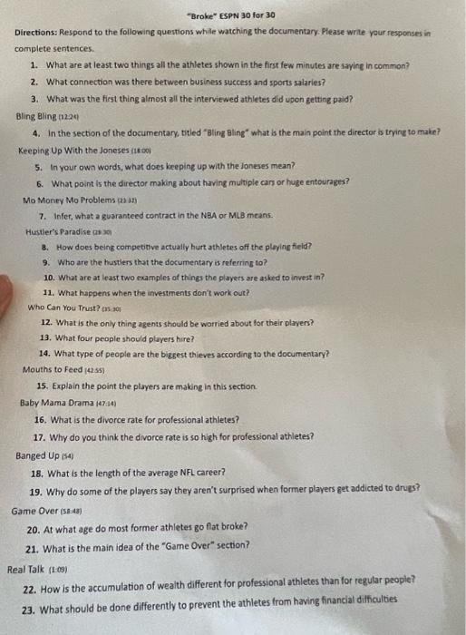 Solved quot Broke quot ESPN 30 for 30 Directions: Respond to the Chegg com