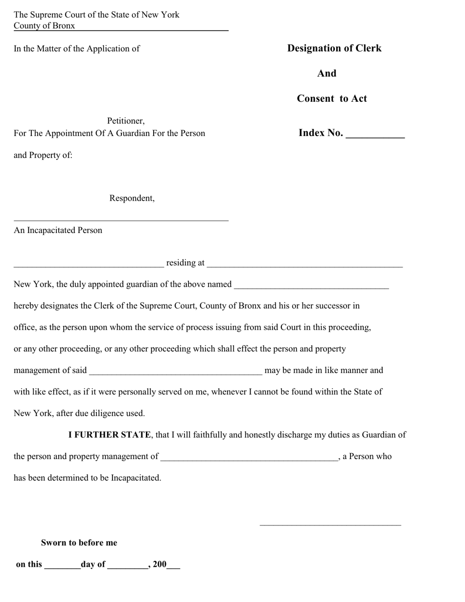 Bronx County New York Designation of Clerk and Consent to Act Fill