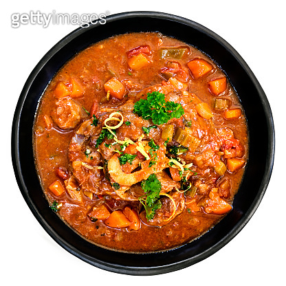 Osso Buco Veal Shanks Casserole in Rustic Black Dish Top View Isolated