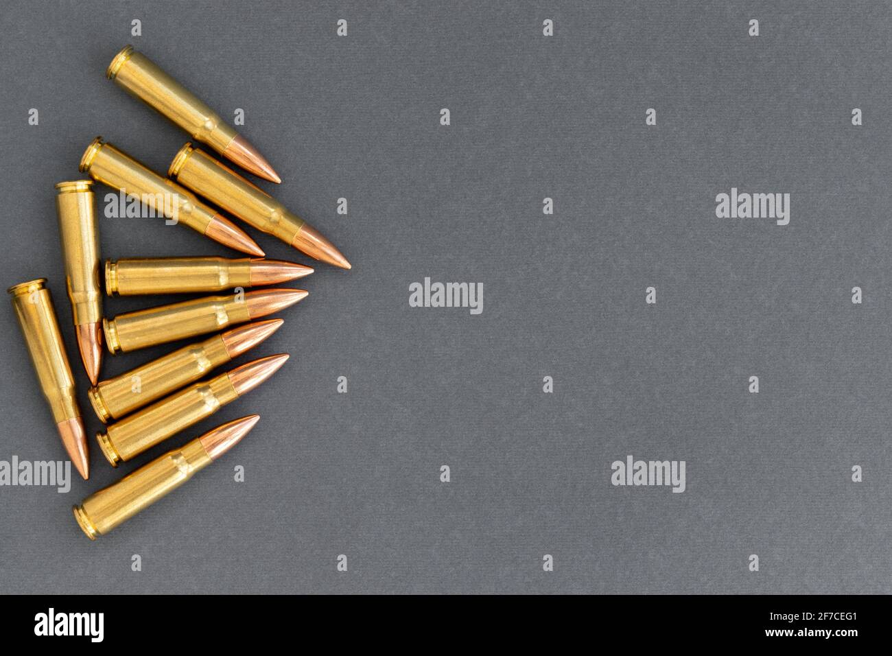 Group of bullets on gray paper background Cartridges 7 62 caliber for