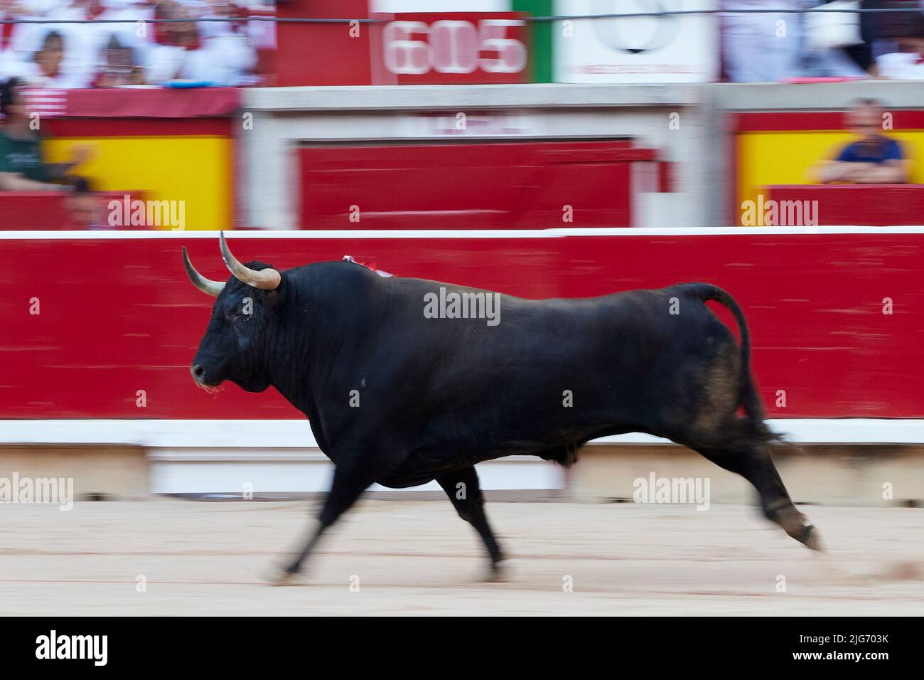 A bull during a bullfight at the San Fermin Festival in Pamplona