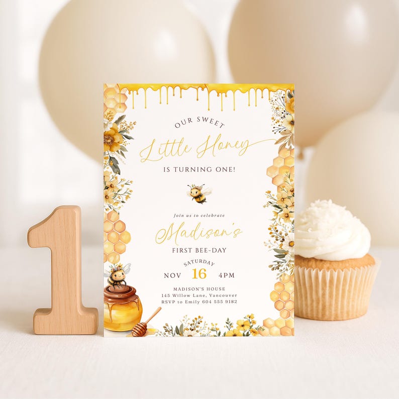Sweet Little Honey Bee First Birthday Invitation Floral Honeycomb