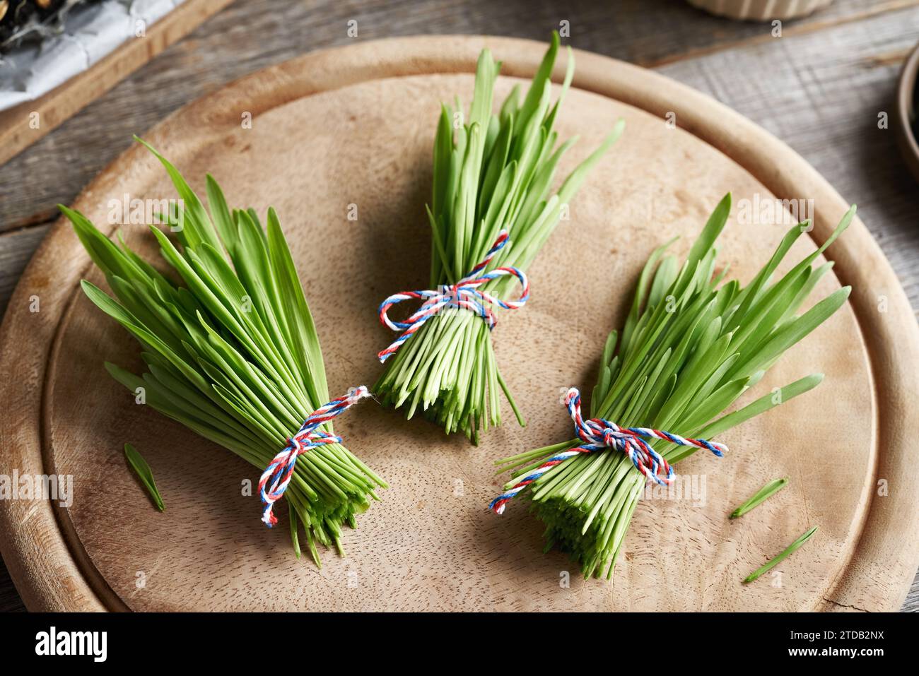 Three bundles of fresh young green barley grass blades on a table