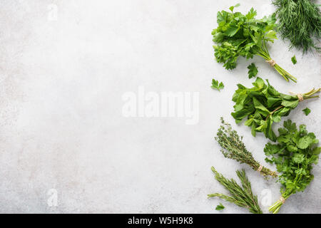 Various bundles of fresh herbs on a wooden background close up Stock