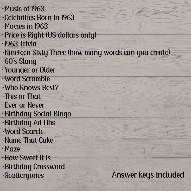Printable Birthday Party Games Born in 1963 Games 20 Game Bundle