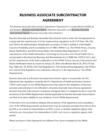 Business Associate (HIPAA) Subcontractor Agreement PDF Word