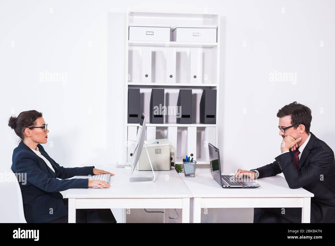 Busy man and woman office workers Business people and technologies