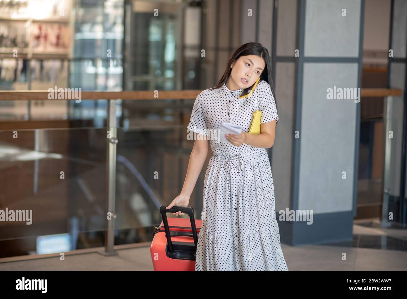 Busy brunette female walking with red suitcase talking on her