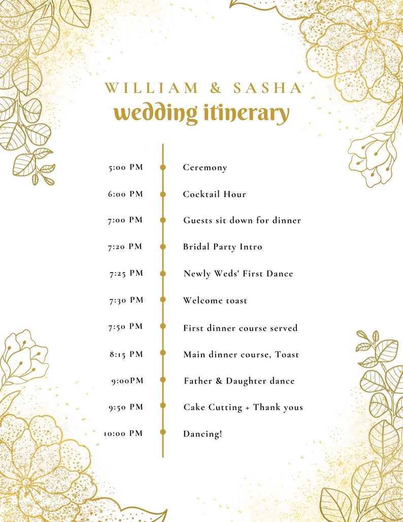 Instant Download Gold Floral Wedding Itinerary Timeline Customizable