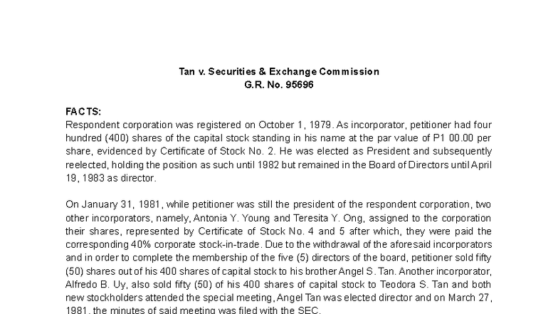 Tan v SEC G R No 95696: Analysis of Stock Certificate Cancellation