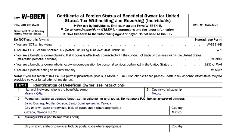 Form W 8BEN: Certificate of Foreign Status for U S Tax Withholding