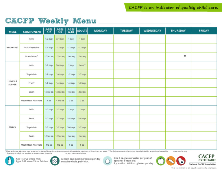 Nutritious CACFP Menu Template for a Week: Breakfast Lunch and